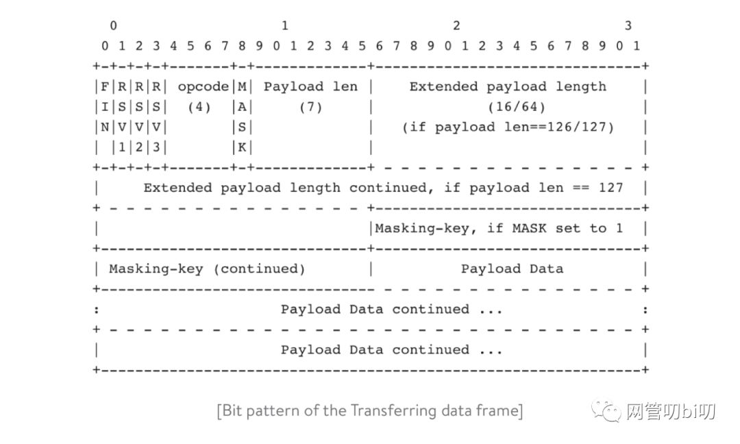 握手成功完成后,您的应用程序可以从客户端读取数据或向客户端写入数据。WebSocket规范定义了一个客户机和服务器之间使用的特定帧格式。这是框架的位模式:
