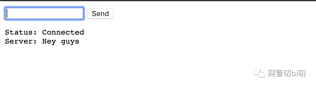<form> <input id="input" type="text" /> <button onclick="send()">Send</button> <pre id="output"></pre></form>...<script> var input = document.getElementById("input"); var output = document.getElementById("output"); var socket = new WebSocket("ws://localhost:8000/ws/echo"); socket.onopen = function () { output.innerHTML += "Status: Connected\n"; }; socket.onmessage = function (e) { output.innerHTML += "Server: " + e.data + "\n"; }; function send() { socket.send(input.value); input.value = ""; }</script>...