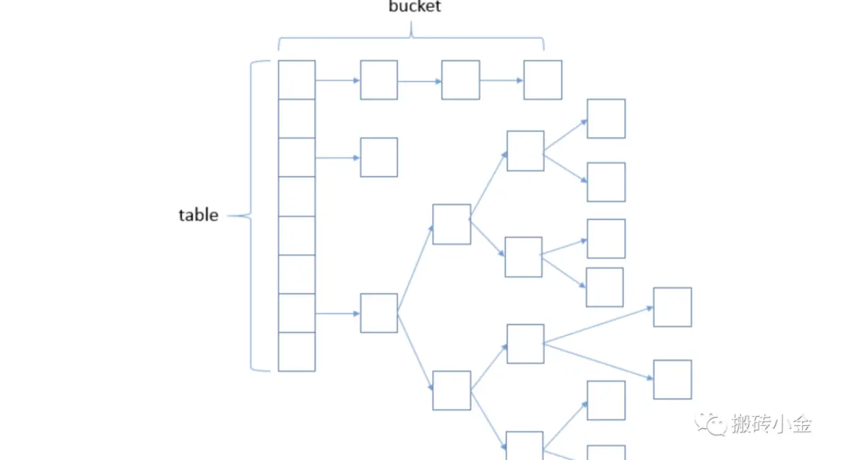 java1.7时存储如上图所示,但是在1.8时候就变成了红黑树存储。