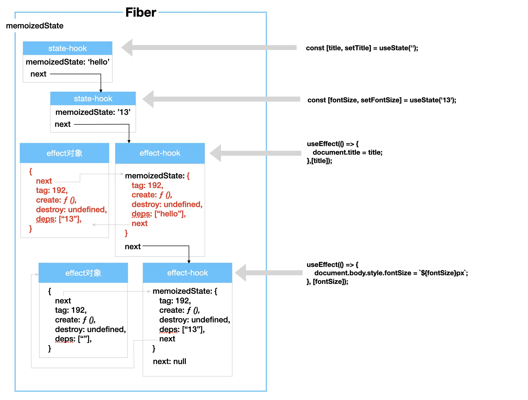 本例中,假设我们在title那里,输入了hello,组件更新完成后,Fiber节点上的hook信息如下: