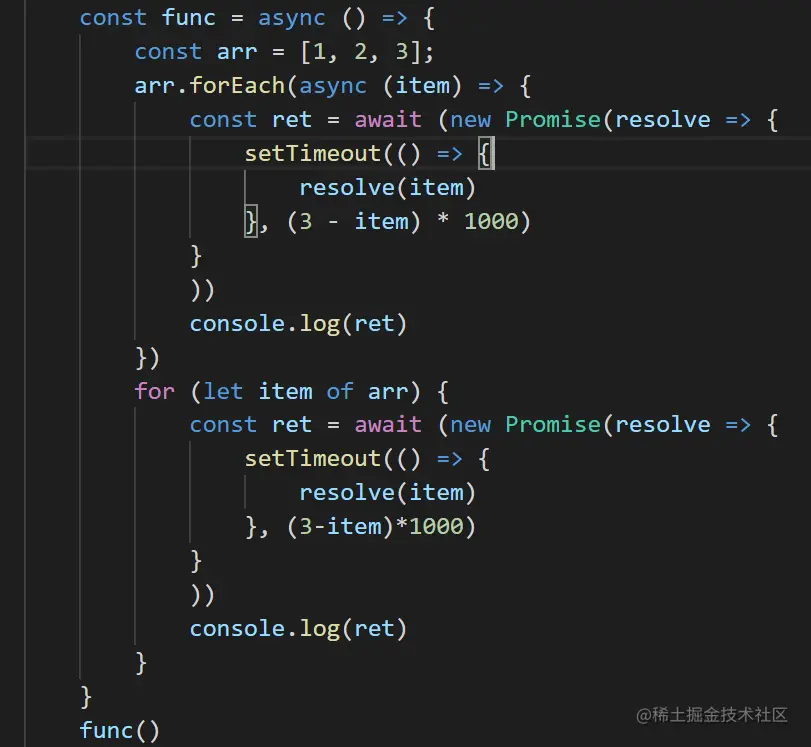 async函数遇到await就把上下文还给外层函数,然后等右边的promise完成之后再拿回上下文, 因为foreach的参数是一个完整的async函数,所以foreach不会阻塞。