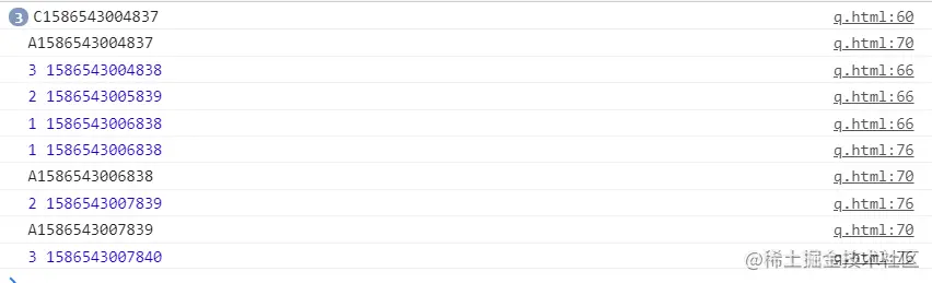 可以看到,时间戳走到上面的循环中,先输出了三次循环,然后输出了下面这个循环的第一次。因为先从上往下走,走到foreach内部第一个循环时,发现是一个async函数,执行它,走到它的内部,new Promise会立即执行,然后触发一次'C'+时间,并且抛出宏任务定时器,然后把console.log(ret,Date.now())丢到.then()中执行,(这是因为async/await是promise的语法糖,转成promise好理解)也就是定时器变成resolve时执行。然后三次循环,每次分别都是async函数((await(定时器)).then(后面的语句,但是在这个async函数内))。
