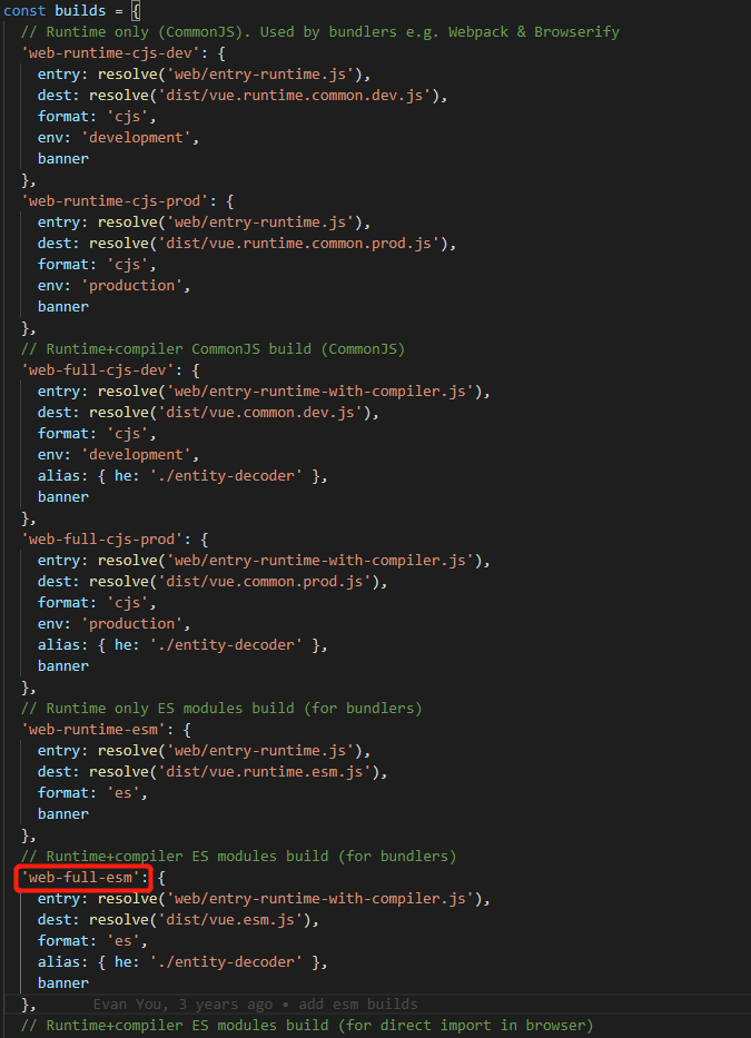 web-full-esm,这是用于构建ES Module且是Vue完整版的配置项
