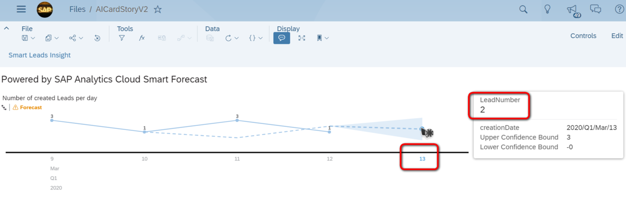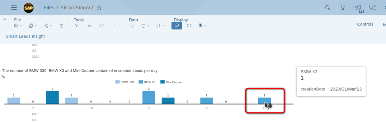 再打开基于这个model创建的story,其中Bar chart里显示的数据已经自动刷新了,我已经能够看到3月13日的数据了: