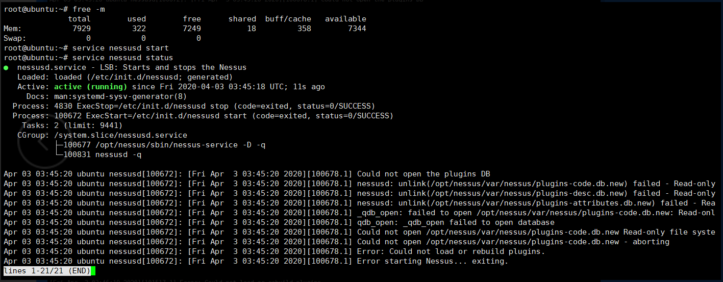 近日客户分配到一台内网虚拟机,查看系统的内存和空间是200G硬盘加8G内存,配置上应该是足够的,但是安装Nessus之后,重启服务报错,服务起不来。