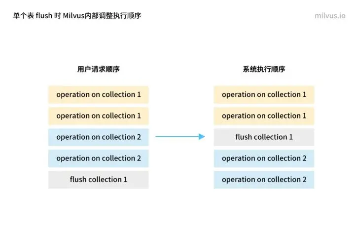 flush 可以指定所有集合,也可以指定单个集合。如果用户指定单个集合,为尽可能短的阻塞用户线程,Milvus 内部还会调整执行顺序并优先执行 flush。下面例子是一种可能的调整结果,调整前后对用户效果等价,但用户线程的阻塞时间会明显减少。
