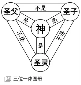 图左应该讲的是基督教中的三位一体。翻译成中文如下。