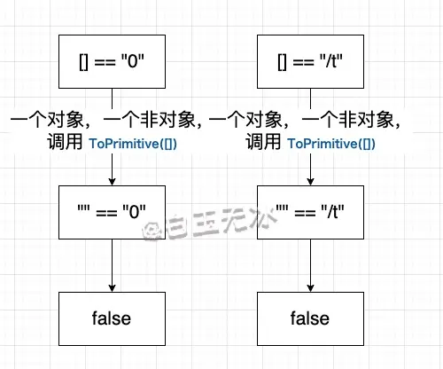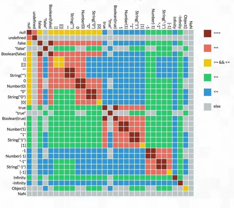 接着看 []=="0" 和 []=="0"。一个操作符是对象,另一个不是。[].valueOf() 还是[],所以调用[].toString(),值为""。详细比较就看下图吧。