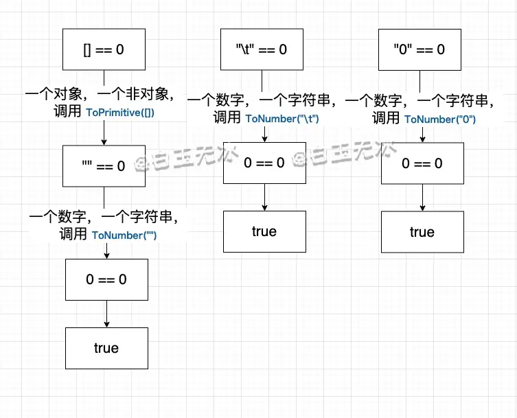 ToPrimitive将对象转成基本值( 先调用对象的valueOf()方法得到基本类型,如果不能得到基本类型则调用toString()) 。再按照上面的规则进行转换。 null和undefined是相等的,与其他值不相等。- 数值