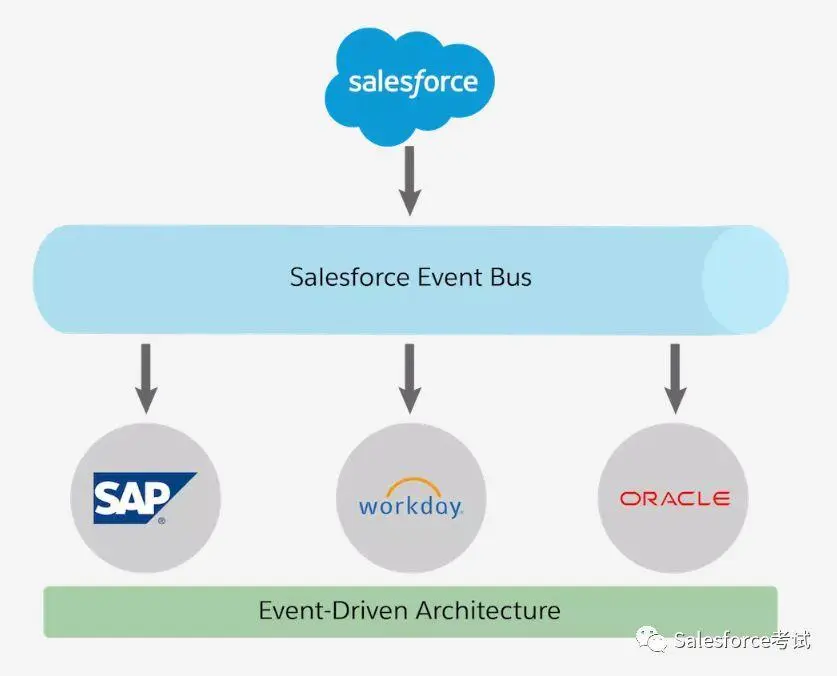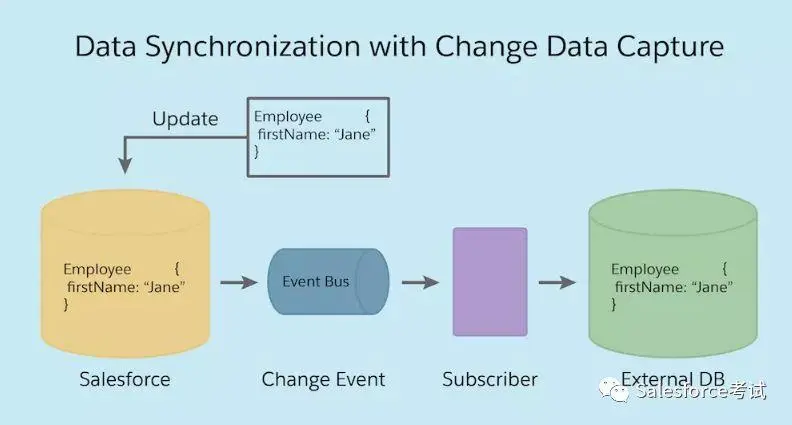可以看看下面的例子,当有一个对象进行更新操作时候,会更新Salesforce的数据,然后通过Change Event 发布相关事件,而同时外部服务监听此事件,从而实现外部数据库和Salesforce数据库的同步。