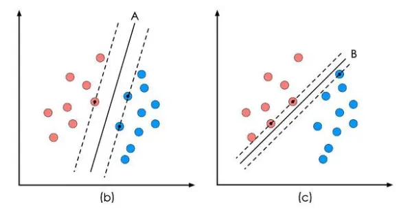 可以看到,这里给出了两种划分方式,就图中实线而言,在逻辑回归中可以称作决策边界,而在SVM中它被称为超平面(hyperplane)。