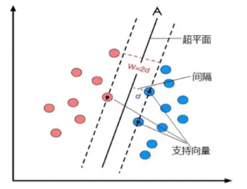 对于这个例子,可以将其准确分类的超平面可能有多个,其中具有最大间隔(两条虚线之间的距离)的超平面就是SVM要找的最优解,这个最优解对应两侧虚线所穿过的样本点,就是“支持向量(support vector)”,支持向量到超平面的距离被称为间隔(margin),如下图绘制标识。