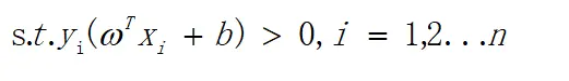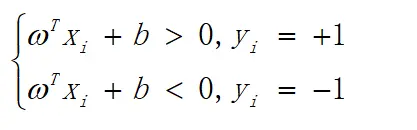 针对上述我们所建分类器,当我们输入数据给分类器时,它会返回一个类别标签,这里先规定蓝色为负样本(-1)、红色为正样本(+1),我们可以得到一组公式,如果超平面能够准确对图中样本点分类,则可得到以下公式:
