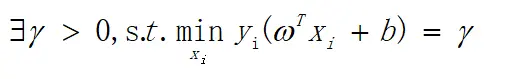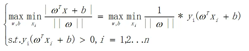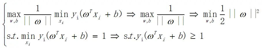 这里再回顾一下上面的最大间隔方程,求最大间隔的思想可以概括为求最小的点到超平面的几何距离的最大化。最小是为了分类时不同类别都能够得到准确分类,距离最大化则是为了获取”最大间隔“,以达到对分类器调优,公式如下: