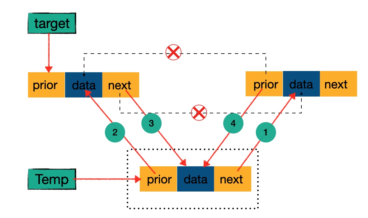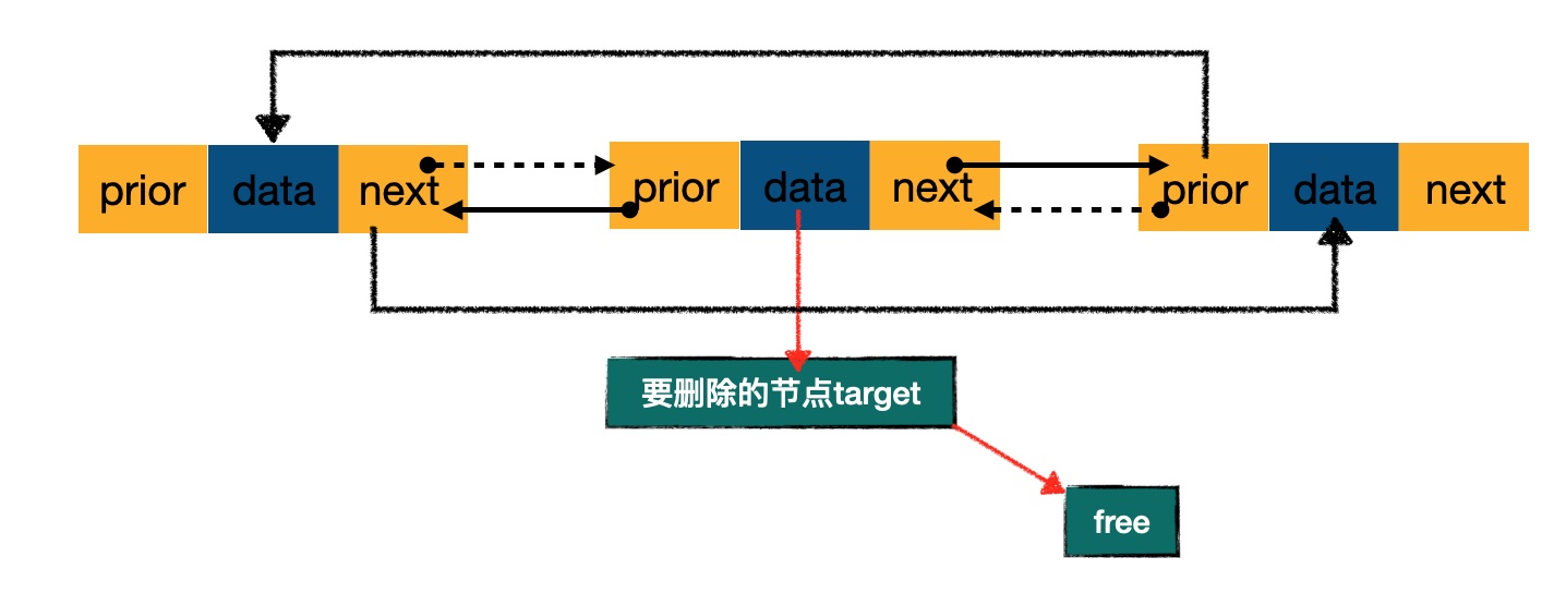当然你也可以用另外一个变量保存要删除节点的前驱节点,这里因为考虑是双向链表,单单一个要删除的节点变量就够用了。