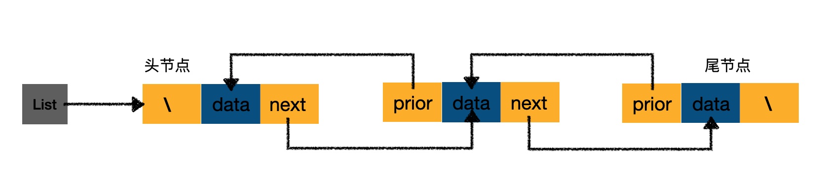 之前的 一篇文展 我们讲述了单链表的概念和实现,我们知道单向链表只有一个方向的,每一个节点只能找到其直接后继节点也就是 next 指针,当我们要找到一个节点只能从单链表头处循环判断,在我们需要直接找到一个节点的前驱节点的时候,我们就需要扩展我们的数据结构让其支持这种逻辑,其大概结构是:
