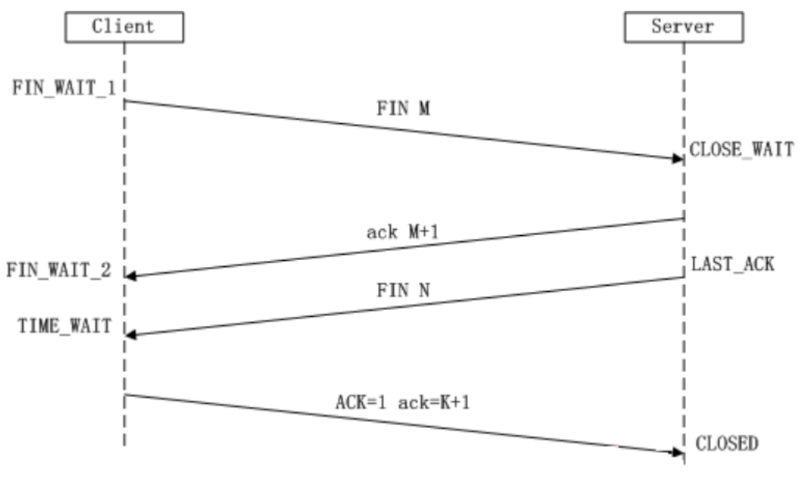 - 第四次挥手:客户端收到 FIN 之后,一样发送一个 ACK 报文作为应答,且把服务端的序列号值 + 1 作为自己 ACK 报文的序列号值,此时客户端处于 TIME_WAIT 状态。需要过一阵子以确保服务端收到自己的 ACK 报文之后才会进入 CLOSED 状态
