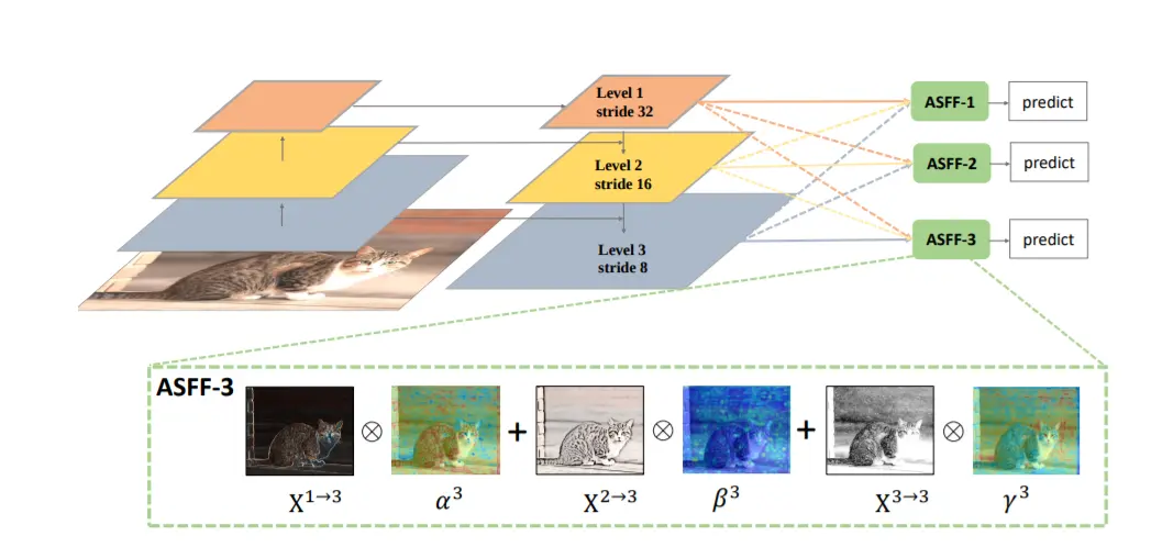 套用论文中的一张图,asff其实有点像FPN,就如同它的名字一样,adaptively spatial feature fusion, 它学习到的特征不仅仅是多尺度的,而且是不同的纹理特征,这对于赋予网络识别不同的类别至关重要。事实上,在实验中,我们发现,添加asff之后,其对应的类别的置信度会得到增强。