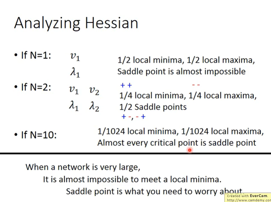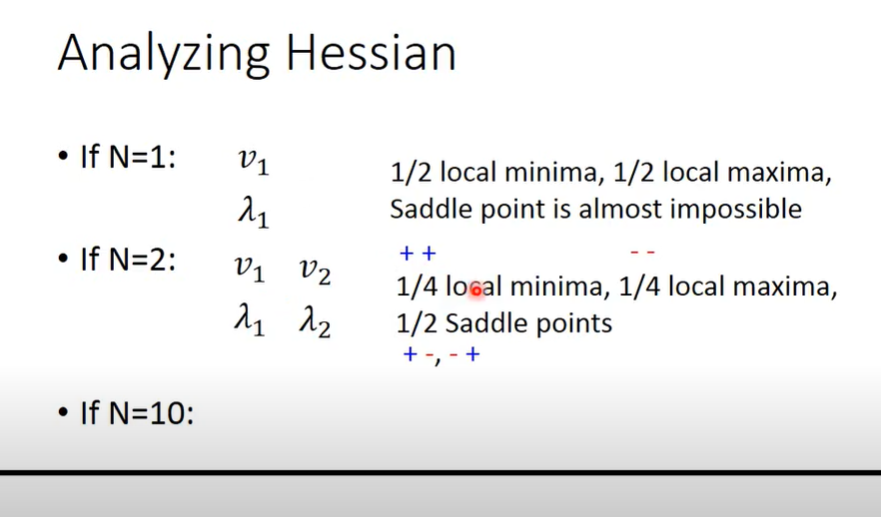 看海塞矩阵(是一个多元函数的二阶偏导数构成的方阵,描述了函数的局部曲率),如果network有N个参数,海塞矩阵则为NxN的对称矩阵,这样的矩阵可以得到N个相互正交的特征向量和对应的N不同的特征值,如果这N个特征值为正数(海塞矩阵正定),则该点为local minima。如果这N个特征值均为负数(海塞矩阵负定),该点为local maximum。如果这N个特征值有正有负,该点为saddle point。
