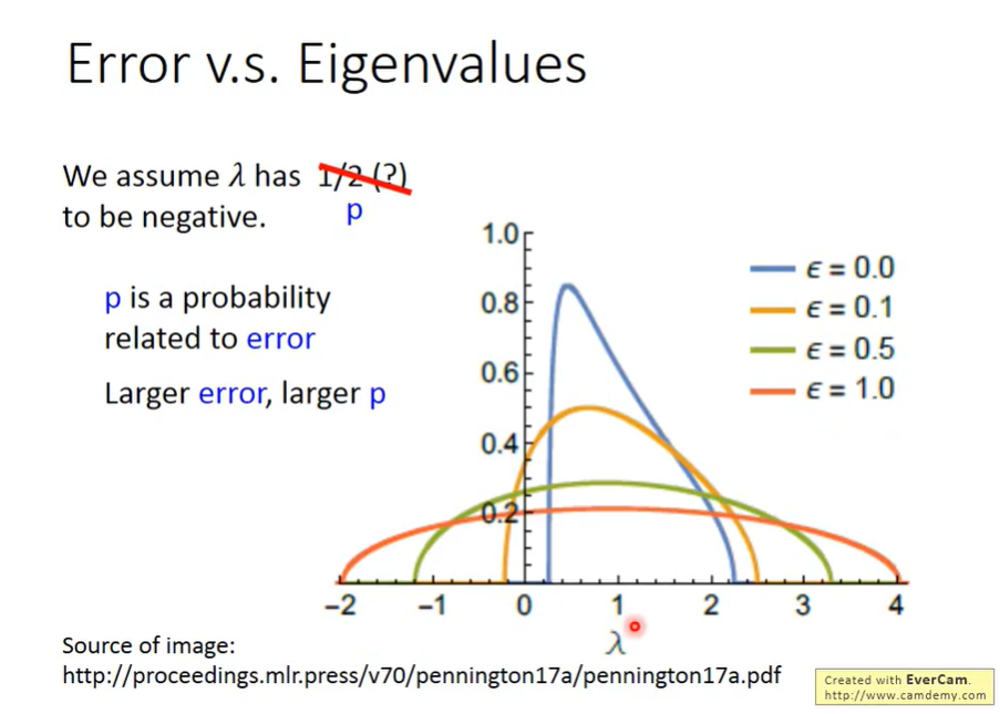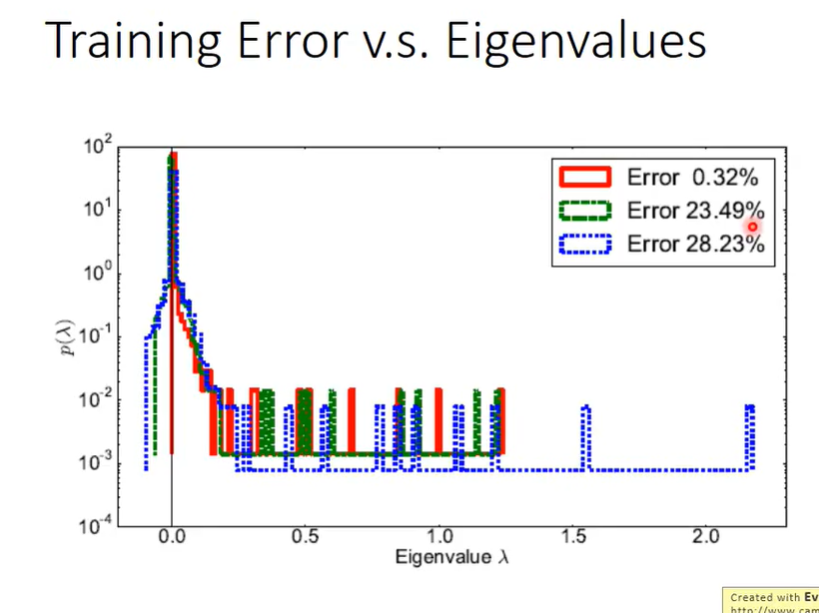 loss大是训练刚开始的时候,loss大时epsilon也很大,如下图,海塞矩阵特征值的分布几乎一半是负的一般是正的,随着loss越来越小,epsilon越来越小,特征值的分布渐渐往正半轴偏,当epsilon为0时,特征值渐渐全是正的了,train到的critical point这时很容易是一个local minima。我们可以得出结论:saddle point很容易出现在loss大的地方,而local minima很容易出现在loss小的地方。