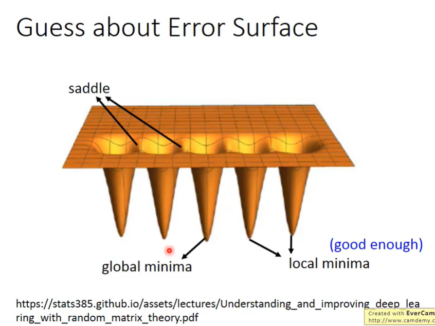learning跟optimization不一样。实际上local minima不用担心,local minima跟global minima是差不多的。但如果在training set上找一个loss最小点,可能是local minima,而local minima的loss和global minima的loss其实差不多的,所以找到local minima也没关系。但如果是鞍点(saddle point)呢?这里来分析一下到底是鞍点还是local minima。