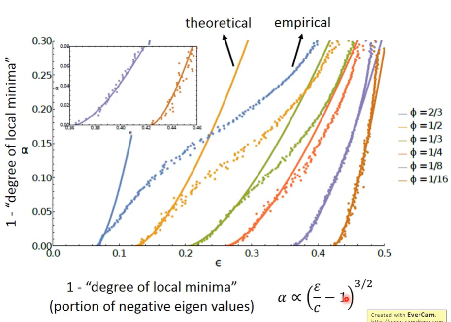 大网络 -> 大网络的loss分布在较小值附近 -> 小loss使得海塞矩阵特征值λ分布在正值的几率大 -> 不容易遇到saddle point -> 容易找到local minima。