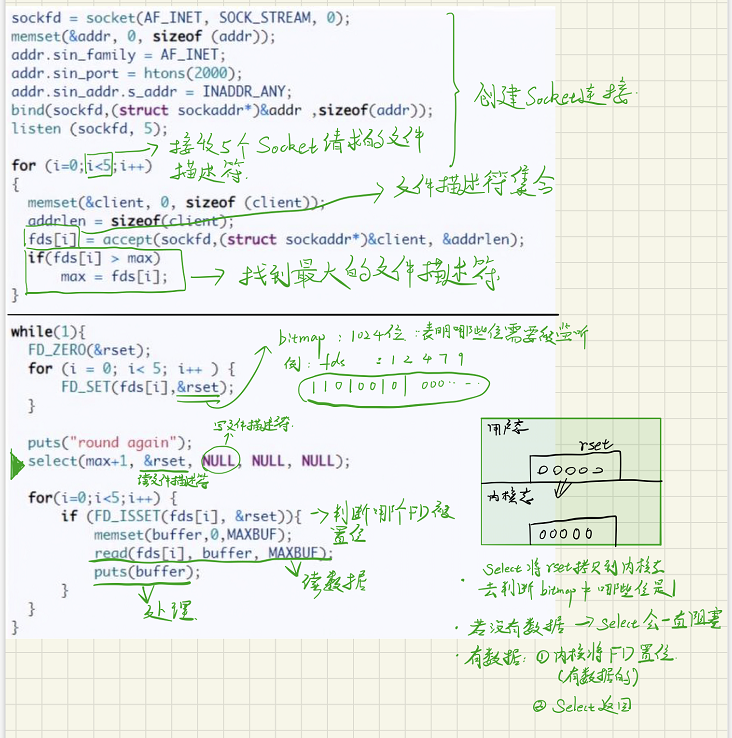 简而言之:select函数将文件描述符收集起来,以bitmap的形式描述,将这个bitmap交给内核,让内核帮我们判断哪些文件描述符里面有数据,当里面有1个或多个文件描述符代表的位有数据时,有数据的FD被置位,select函数返回这个FD集合,否则函数阻塞。 程序返回后循环读取FD集合,读取被置位的数据,并进行处理。 select提高效率最关键的一点是将rset交给内核去处理,提高了效率。