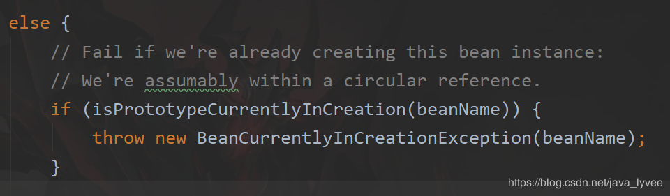 不进if分支,则进入这个else分支,把throw删了 就一句代码;判断当前初始化的bean----X 是不是正在创建原型bean集合当中当中? spring源码当中关于这行代码有两行javadoc