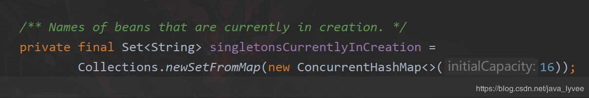 其实就是一个set集合,当运行完this.singletonsCurrentlyInCreation.add(beanName) 之后结果大概如下图这样