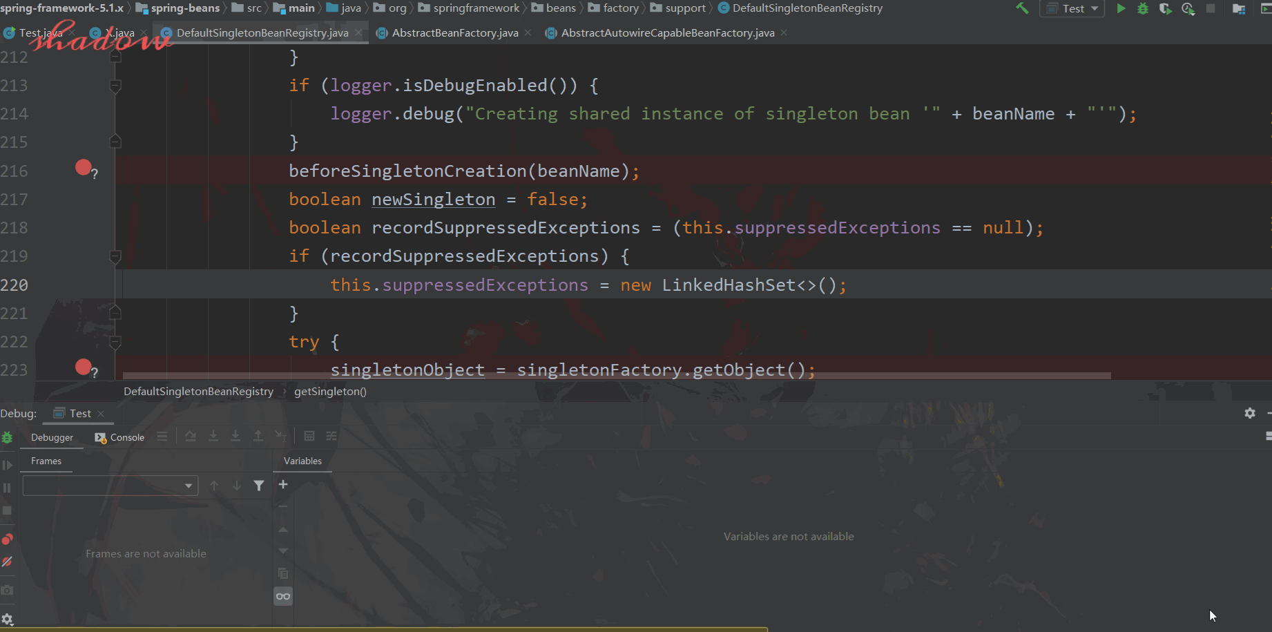 这段代码就比较重要了,关于上面说那个正在创建和正在销毁的集合;这段代码就能解释,所以如果上面你没看明白那个集合的意义,笔者这里用spring源码来说明一下;先看看当代码执行到这里的时候语境