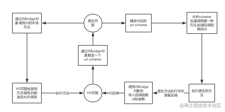 基本原理:H5->通过某种方式触发一个url->Native捕获到url,进行分析->原生做处理->Native调用H5的JSBridge对象传递回调。