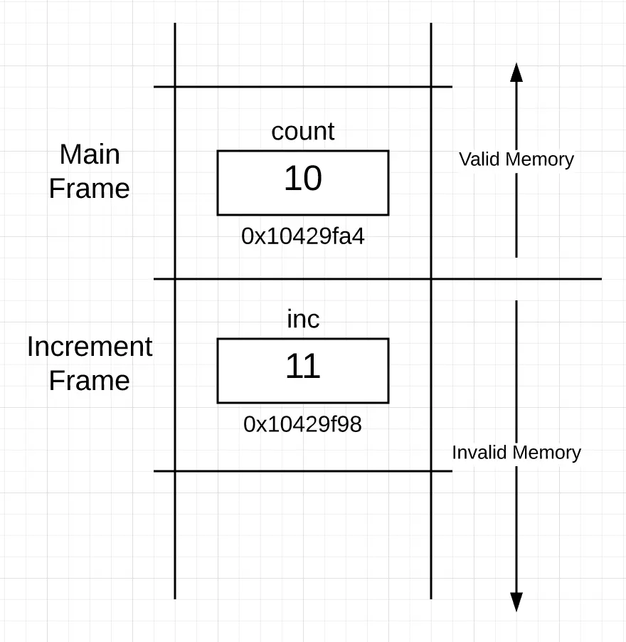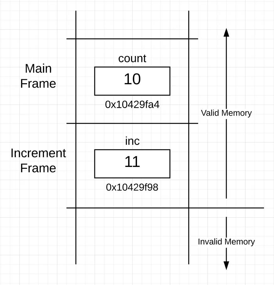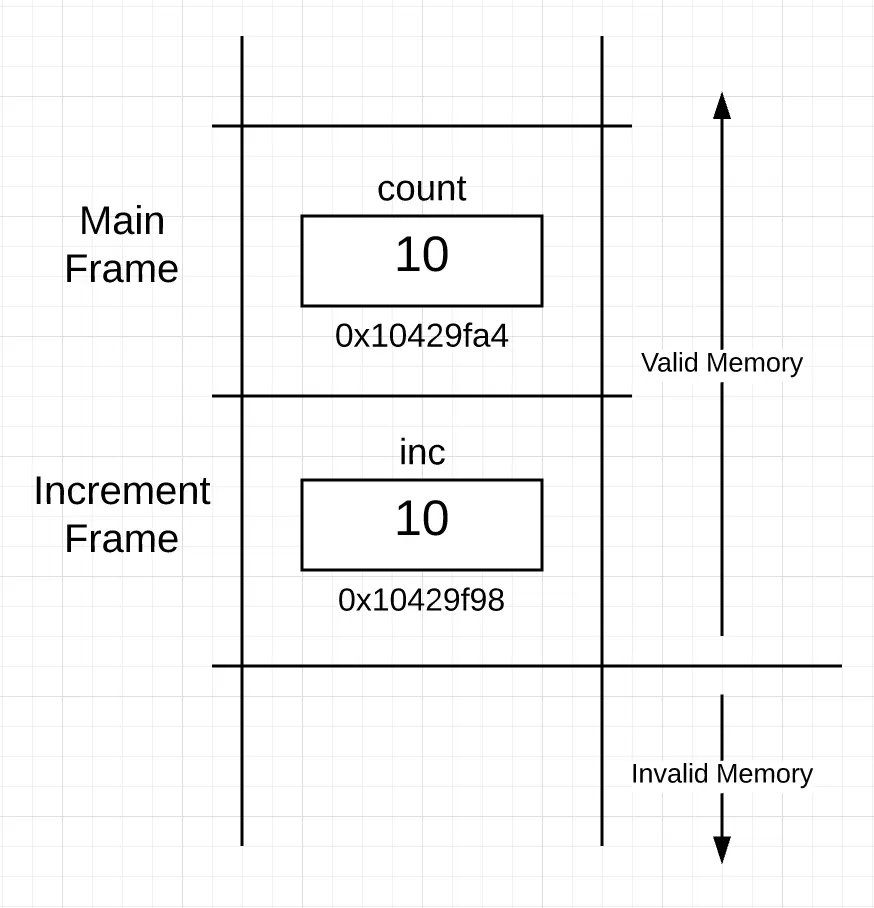 如果你仔细查看第 12 行对 increment 函数的调用,你会发现函数间传递的是变量 count 的值。此值会被赋值、传递并且在新的帧内分配内存以便 increment 函数的调用。我们需要记住,函数 increment 只能直接的读写帧内的内存,所以它需要用 变量 inc 来接收、存储和读取变量 count 所复制的值。