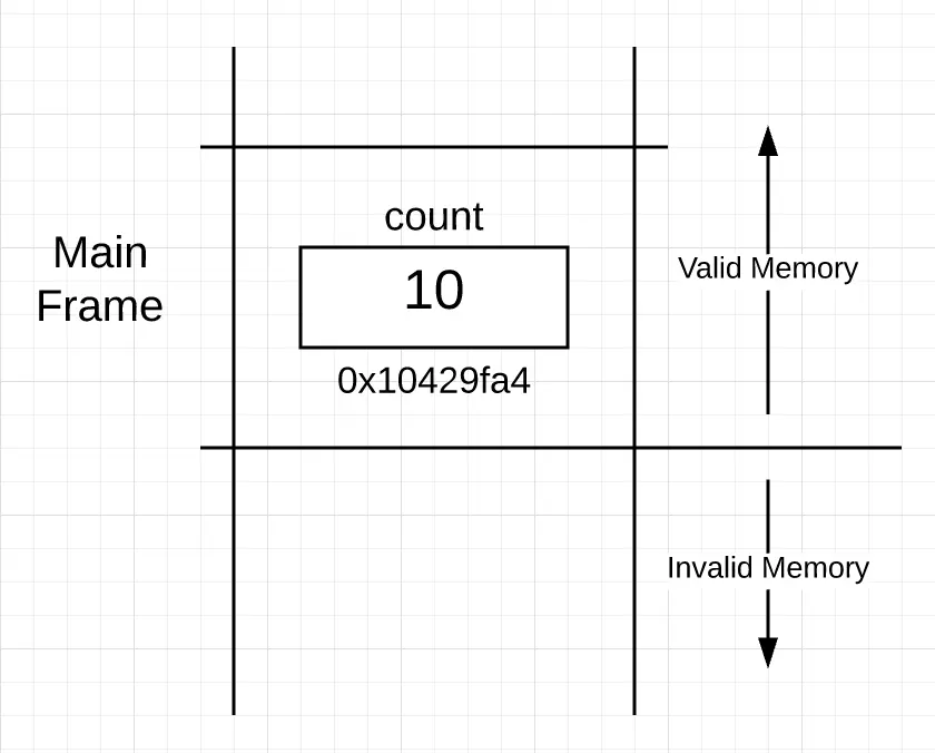 你可以在 Figure 1 中看到 main 函数被分配了一个一帧的栈空间。这个部分称为"栈帧",正是这个"栈帧"表明了 main 函数在栈中的边界。在函数调用的时候,这个帧作为代码的一部分被创建。你可以看到变量 count 的地址为 0x10429fa4,是在帧的内存空间内的。