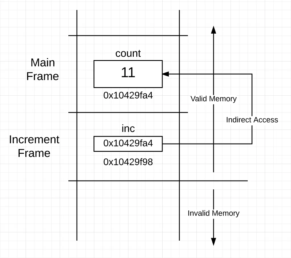 此时*是一个操作符,用于操作指针变量所指向的值。指针变量可以通过间接的方式操作位于其所在函数帧外的变量的值。虽然可以操作,但是函数 increment 仍然需要通过位于其帧内的用于存储帧外变量的地址值才可以进行。