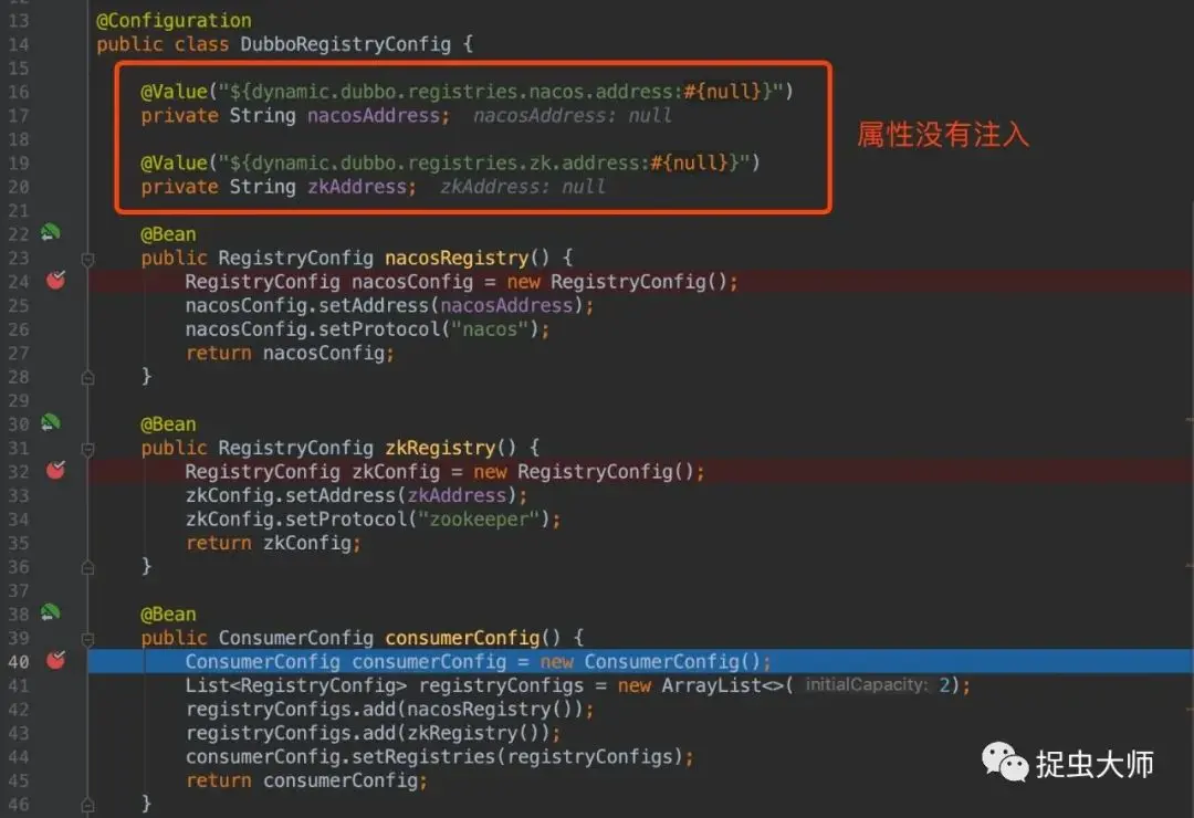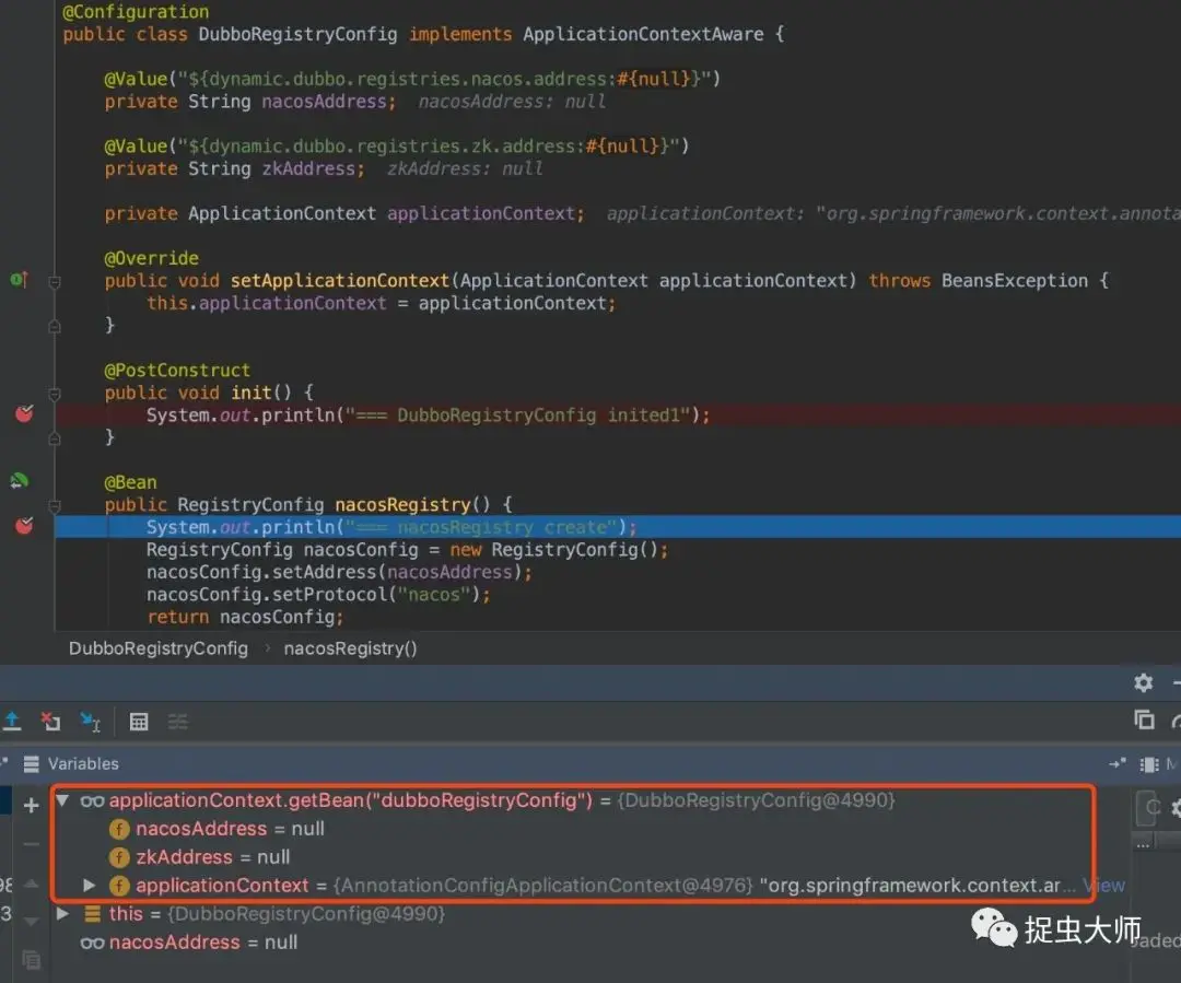 的bean了,但是@PostConstruct依然不执行,属性依旧没有注入。先捋一捋,我们最初的问题是@Configuration无法注入@Value,通过@Import导入@Configuration,@Configuration本身不是一个bean,自然@Value就无法装配属性,但当我们改成包扫描后,能获取到@Configuration本身的bean,但是属性依然没有注入@PostConstruct依然没有执行。bean生成了,但@Value与@PostConstruct注解没有生效,我们把焦点放到这两个注解上,这两个注解是怎么实现的?查询了一下资料,@PostConstruct是依靠InitDestroyAnnotationBeanPostProcessor实现,@Value是依靠AutowiredAnnotationBeanPostProcessor实现,从名字上就能看出这两个类实现了BeanPostProcesser,BeanPostProcesser提供了在bean执行初始化(init-method)前后插入hock的能力。也就是说,DubboRegistryConfig的bean没有执行BeanPostProcesser,为了验证猜想,断点找出堆栈,顺藤摸瓜