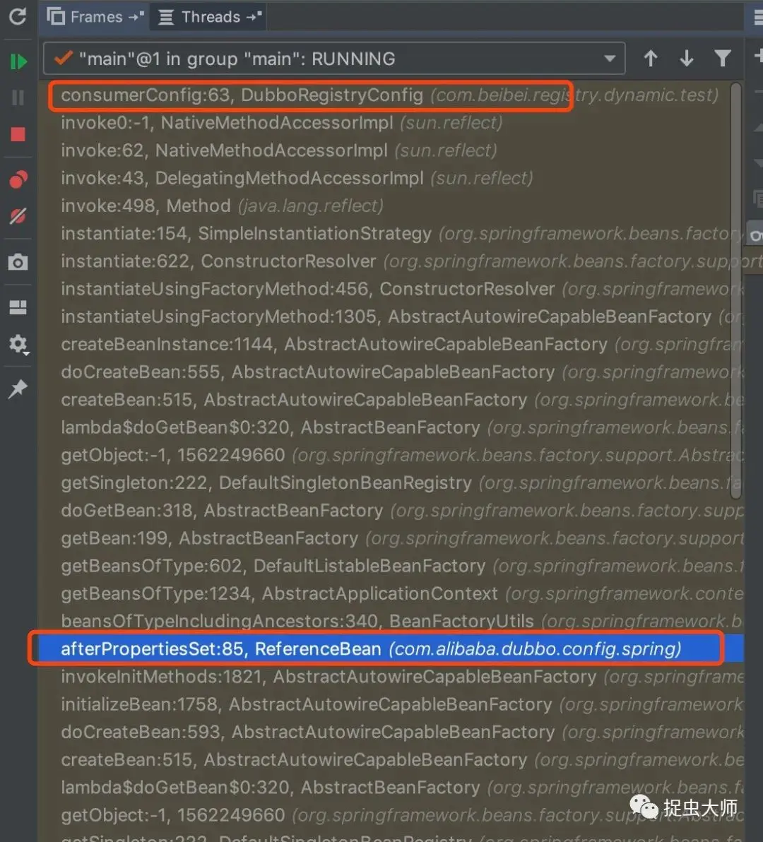 从堆栈中发现了是dubbo的ReferenceBean触发了DubboRegistry的bean的初始化