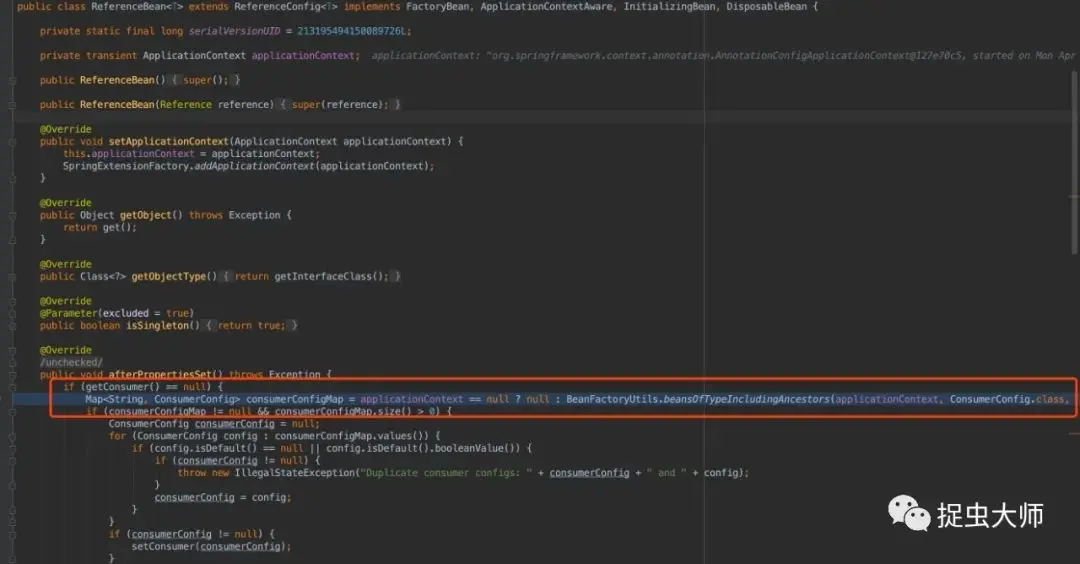 于是ReferenceBean实例化时触发DubboRegistryConfig中bean的实例化,进而触发