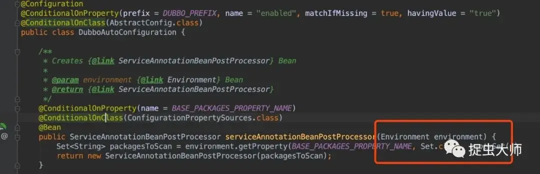 呢?又是谁初始化ReferenceBean的?接着调试,发现Spring容器初始化的时候初始化了那么问题归结于,为什么在BeanFactoryPostProcessor中会创建bean呢?接着调试,ServiceAnnotationBeanPostProcessor定义在DubboAutoConfiguration,并且需要注入一个Environment