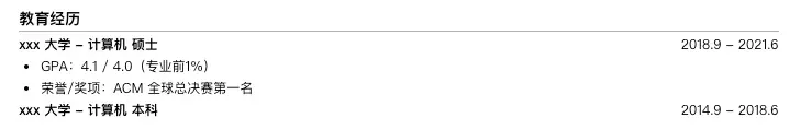 「教育经历」这个模块,如果是实习生/应届生,应该将他放在「个人信」息和「实习/工作经历」之间,如果是社招,我觉得应该放在「其他」之前就好了,毕竟「工作经历」和「项目经历」才是重点。