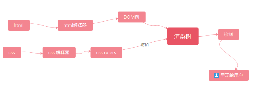在浏览器中获得HTML CSS,HTML和CSS解释器会对其进行解析,HTML进行解析后在DOM元素的参与下会构建DOM树,DOM树添加CSS规则后生成渲染树,浏览器就可进行页面的绘制啦 绘制完成后就是我们所看到的页面啦。