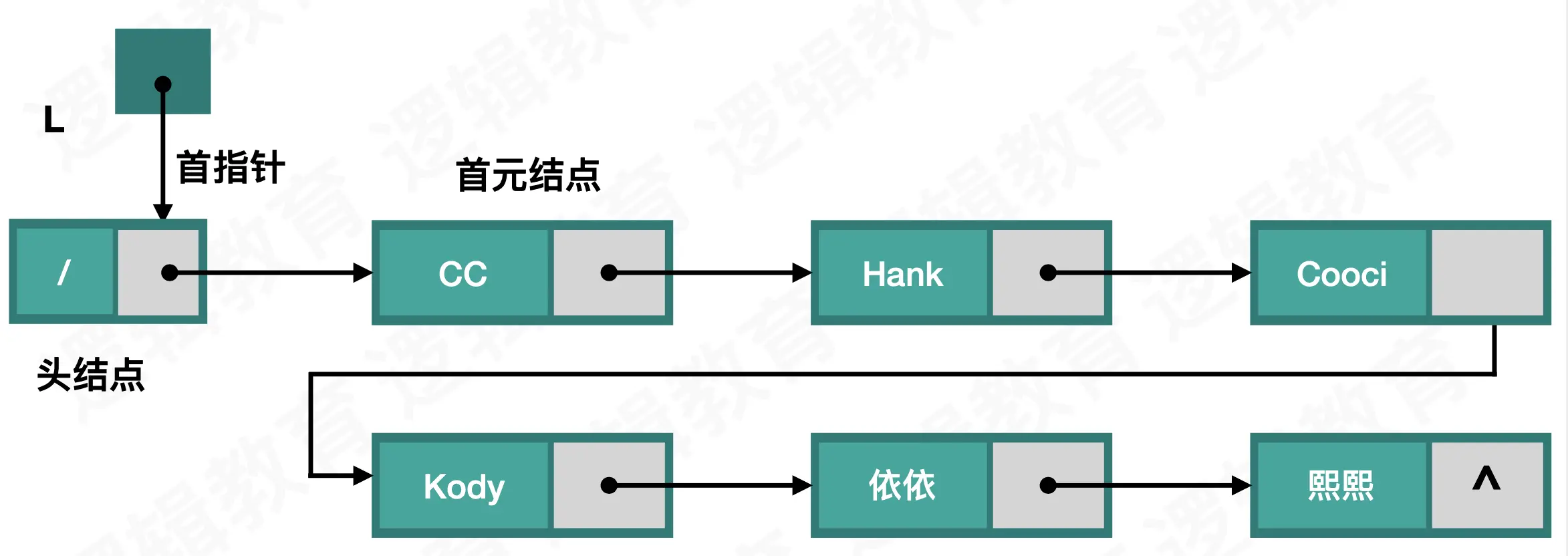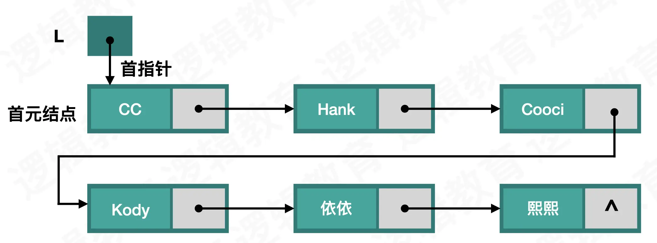 作为一个单链表,每个结点中都有指针域和数据域: