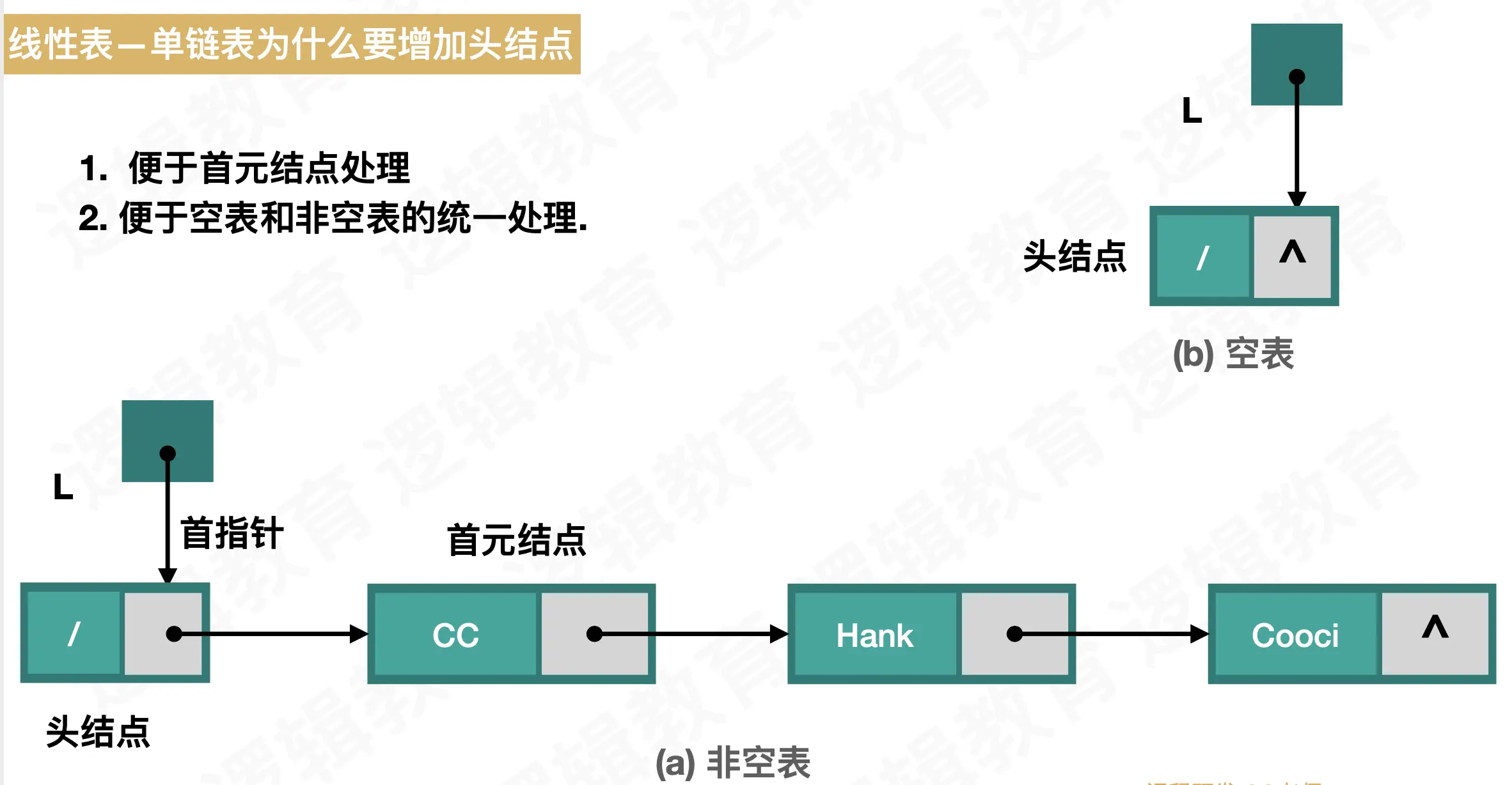 - 先建立待头结点的单链表,并判空处理
