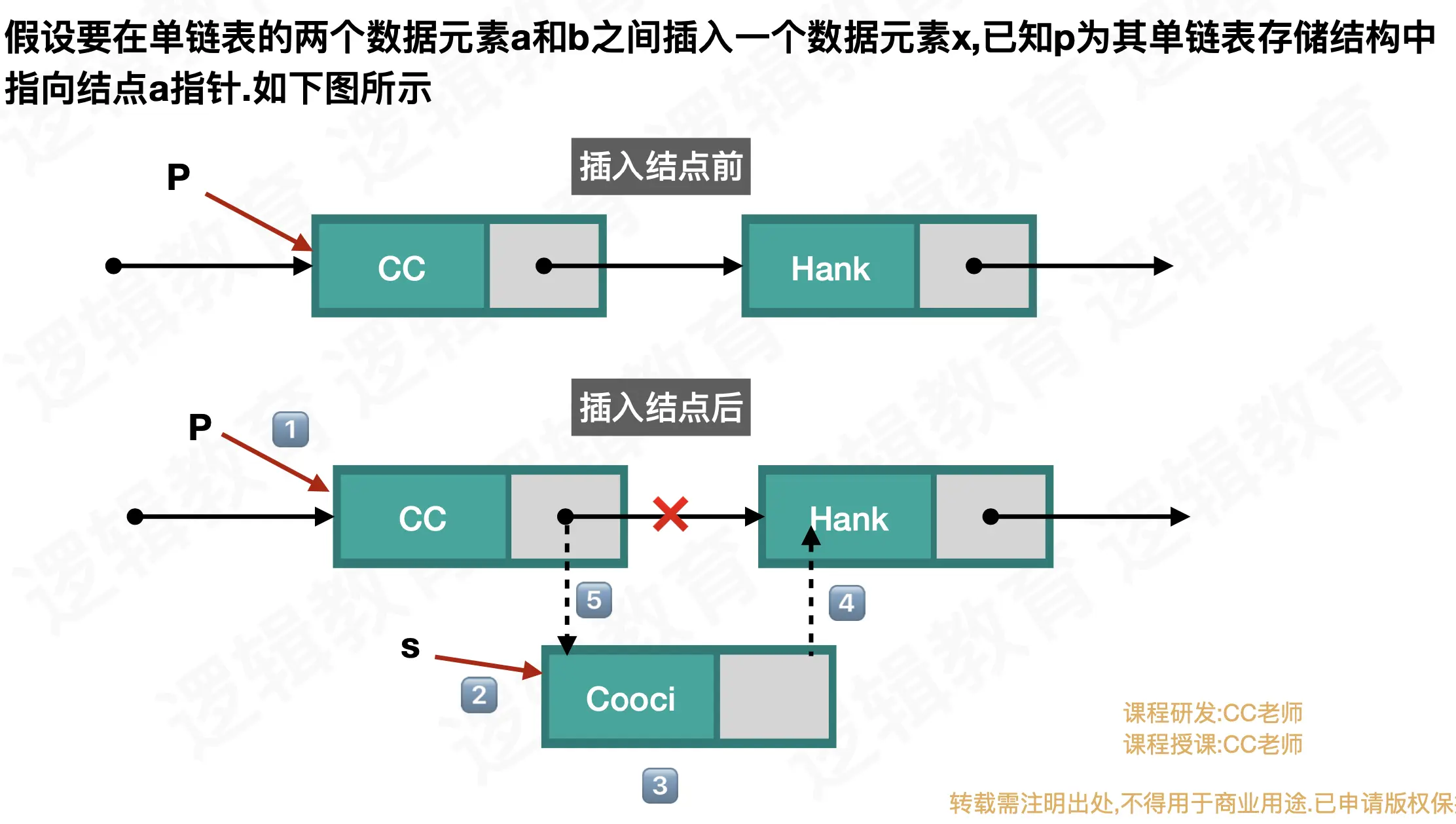 - 将新结点指向p->next(这里一定要先第4步在第5步,防止后面的结点丢失,找不到)