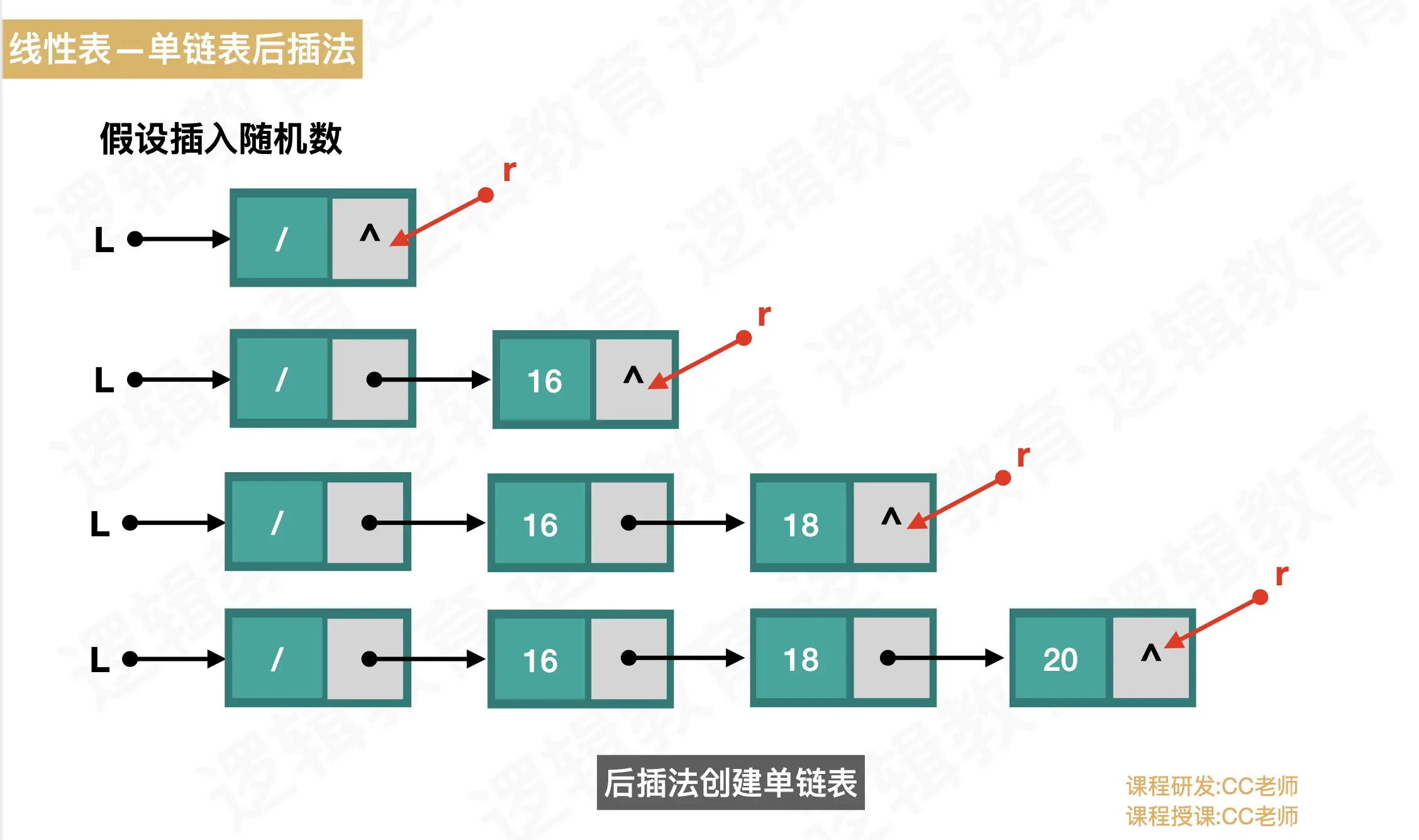 - r->next执行新的结点,再记录新的结点为尾节点r