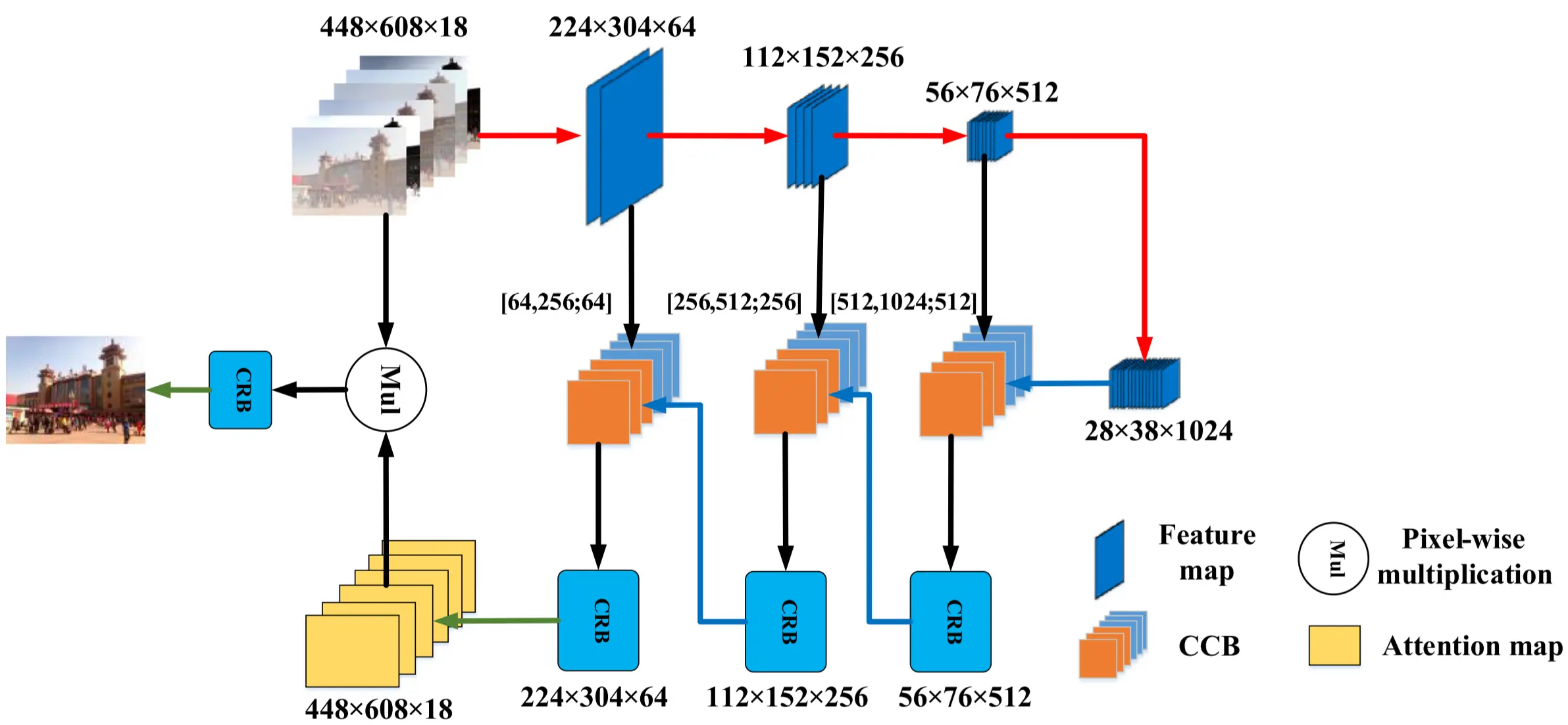 - 引入了一个名为通道压缩块的网络模块。 此外,值得注意,输入图像一共有6张,包括了前文提到了5张增强图像和原始有雾图像。最终得到了6张权重图(Attention map),相乘后相加即得到最终的无雾结果。