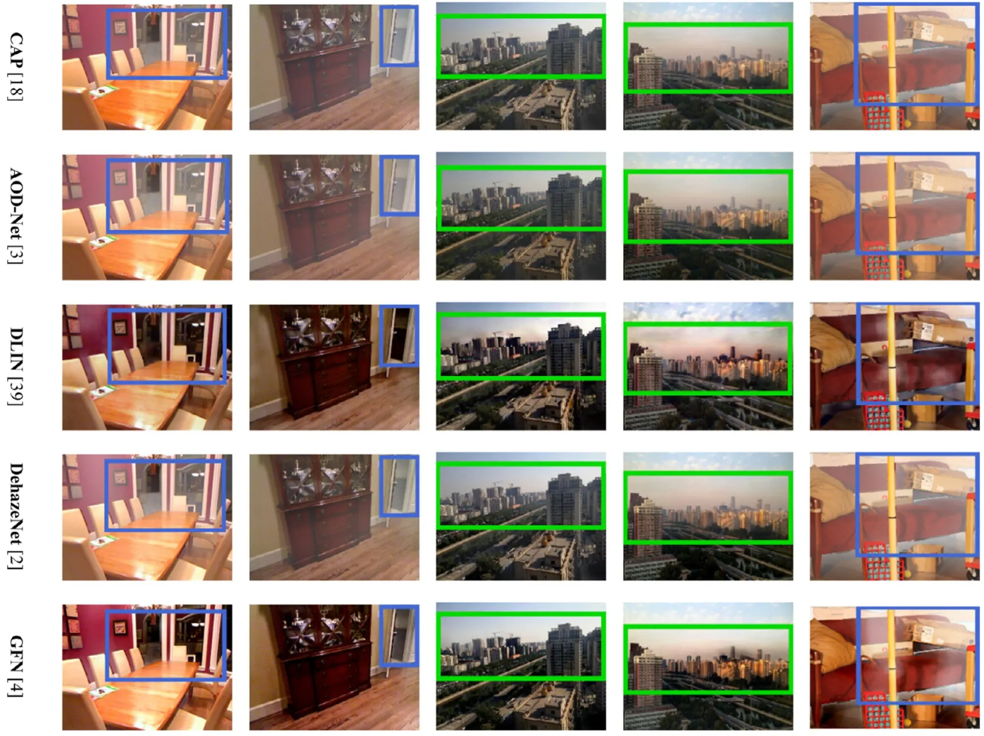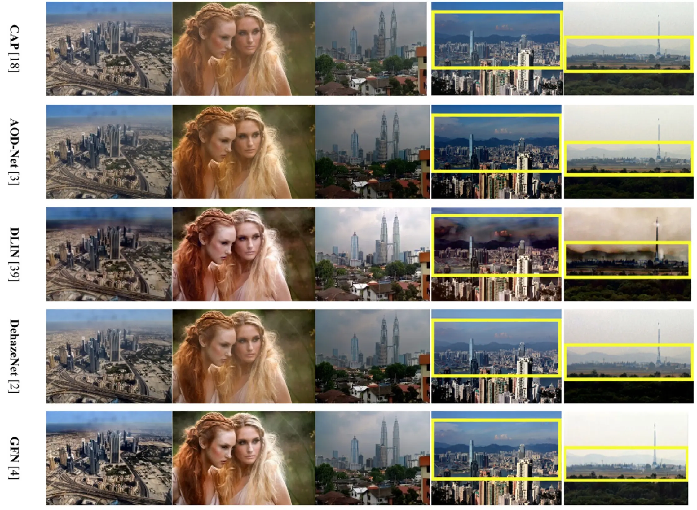 尽管这些挑战的一部分已通过现有方法解决,但在保持清晰轮廓和原始图像的颜色分布的同时,以高视觉质量恢复无雾图像仍然是具有挑战性的问题,尤其是在不同雾度下具有不同雾度的自然雾图像场景。 大多数除雾方法都更多地集中在透射图和大气光的估计上,随后通过大气散射模型生成无雾图像。所有这些方法都强烈依赖于某些先验或假设,无效的先验可能会导致不佳的恢复结果。 最近的GFN 通过对三个导出图像进行门控来产生去雾图像。但是,该算法无法还原遥远的场景以及雾度高的损坏图像。文章提出算法相比较GFN有以下几个优点: