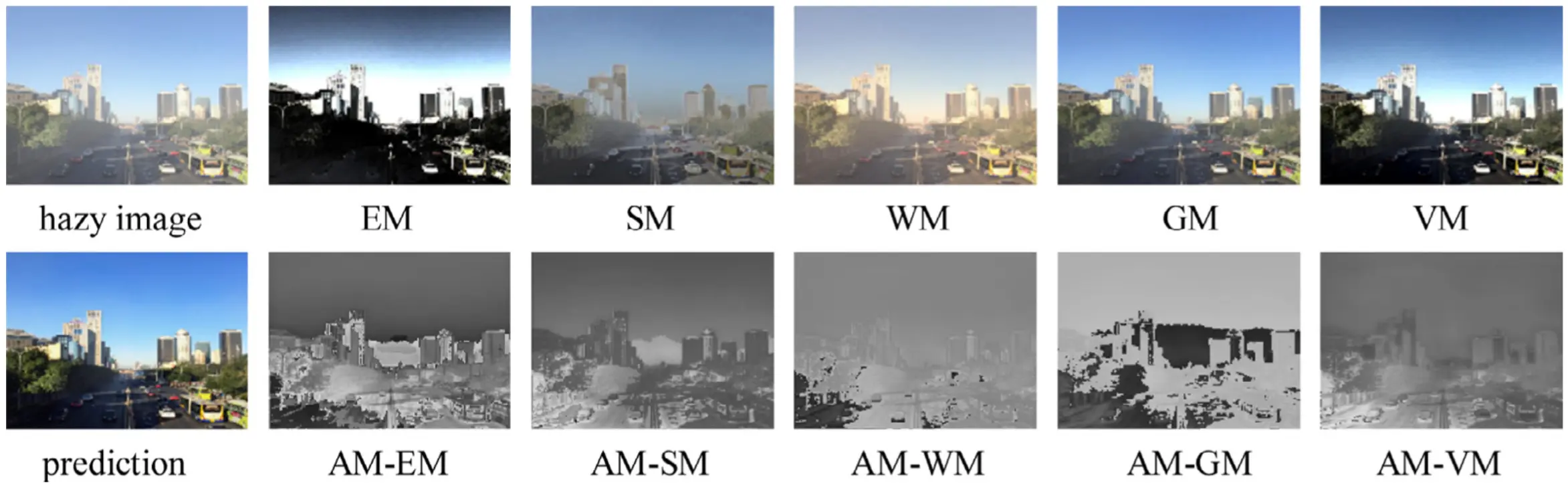 文章提出了一种基于派生图像融合策略的深度卷积网络。文章基于有雾场景特征从原始朦胧图像中提取了五张派生图像,分别为曝光图(EM),显着性图(SM),白平衡图(BM),伽玛校正图(GM),雾度面纱图(VM)。为了融合这五张图,文章提出了一个自编码器生成权重图,权重图逐像素乘上派生图累加后即可得到最终去雾结果。