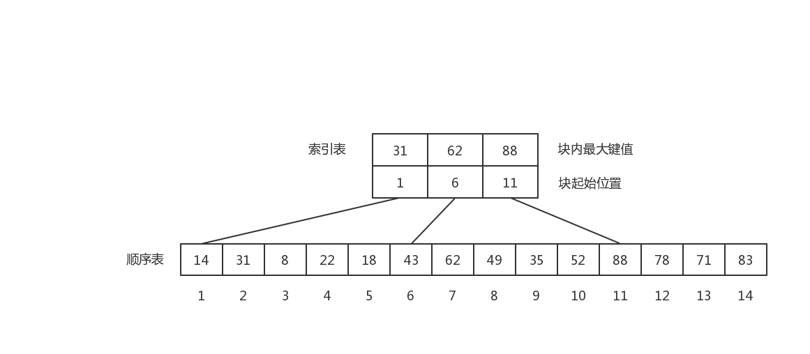 - 查找分两个部分:先对索引表进行二分查找或顺序查找,以确定待查记录在哪一块中;然后,在已确定的块中用顺序法进行查找。