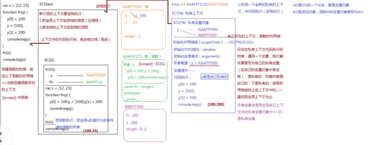 EC:执行上下文,指的是当执行代码的时候,会形成一个全局的执行上下文(EC(G)global量),在里面也可以创建局部的执行上下文(EC(...),例如函数环境)。
