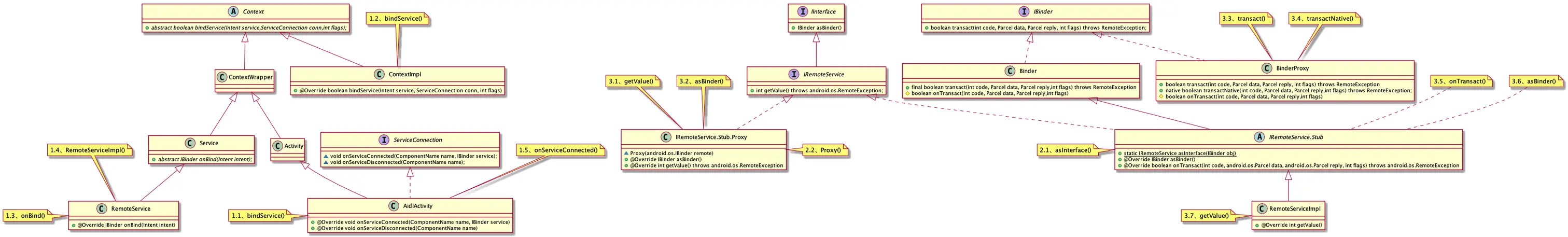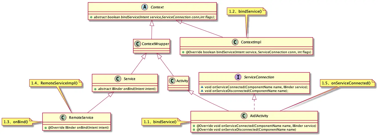 1.1、Activity中通过bindService()方法绑定远程服务RemoteService,具体实现方法是ContextImpl的bindService()方法。